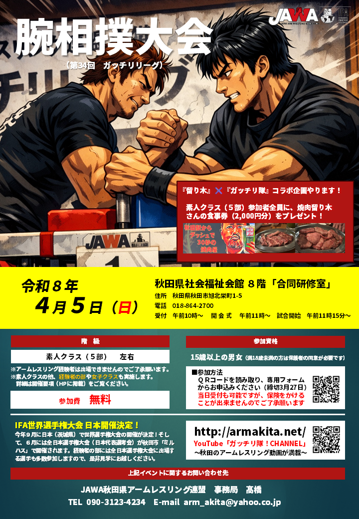 第34回ガッチリリーグ(腕相撲大会)を開催します! 【第34回ガッチリリーグ開催】 以下のとおりアームレスリング大会を開催しますので、たくさんのご参加お待ちしてます💪 月 日 令和8年4月5日(日) 会 場 秋田県社会福祉会館 8階「合同研修室」 その他 開催要項はこちら 第34回 ガッチリリーグ 開催要項 申込みはこちら https://forms.office.com/r/jZZ361ysZS ※5部参加者には焼肉留り木さんの食事券(2000円分)をプレゼント ※チラシは初心者申込用 ツイート
